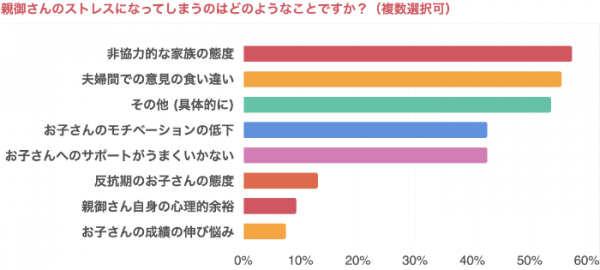 「その他(具体的に)」が53%、「お子さんのモチベーションの低下」が42%、「お子さんへのサポートがうまくいかない」が42%、「反抗期のお子さんの態度」が13%、「親御さん自身の心理的余裕」が89%、「お子さんの成績の伸び悩み」が7%、という結果となりました。