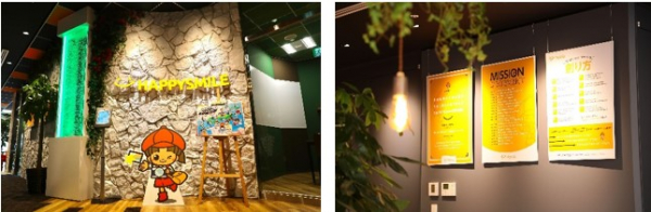 エレベーターを降りるとHAPPY SMILE のロゴと広報部長キャラクターの「エミちゃん」がお出迎え。