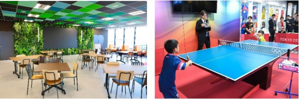 東京五輪でも使用された卓球台なども設設置されており、ご来客者様との打ち合わせにも使えるオープンな空間です。
