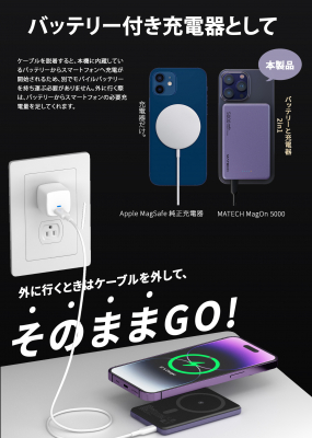 スマートフォン・タブレット関連製品を主に企画開発する京都のクリエイティブブランド、MATECH株式会社は2023年9月26日、世界最薄、厚さたったの8.6mm、バッテリー兼充電器「MagOn 5000」を発売致しました。(URL:https://www.amazon.co.jp/dp/B0CBSH3XC5 ) Amazon.co.jpでの価格は税込み5,990円(2023年9月26日時点)です。