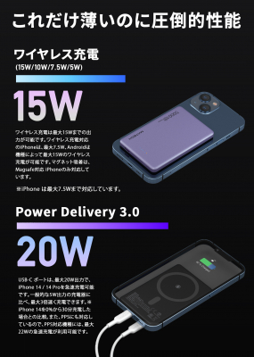ワイヤレス充電は最大15Wまでの出力が可能です。ワイヤレス充電対応のiPhoneは、最大7.5W、Androidは機種によって最大15Wのワイヤレス充電が可能です。マグネット吸着は、Magsafe対応 iPhoneのみ対応しています。