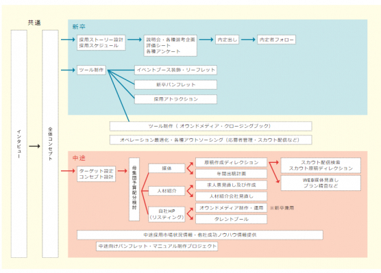 ・メディア選定、求人広告作成、採用ツールや採用サイトなどの設計制作、