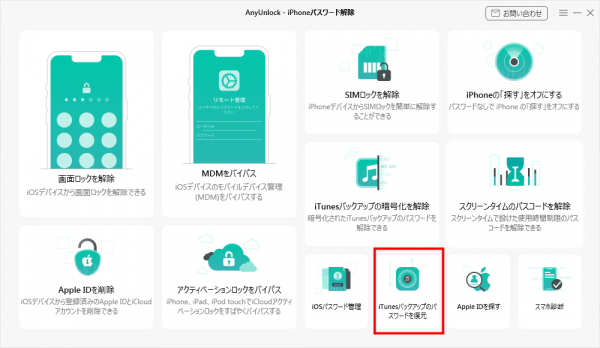 Step 1.AnyUnlockを起動して、「iTunesバックアップのパスワードを復元」機能に入ります。