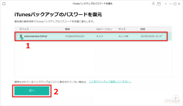 Step 2.解析したい暗号化されたバクアップを選択して「次へ」ボタンをクリックします。