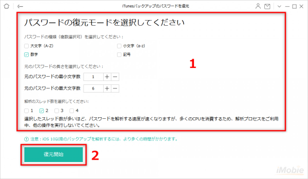 Step 3.パスワードの復元モードを選択して「復元開始」ボタンをクリックします。