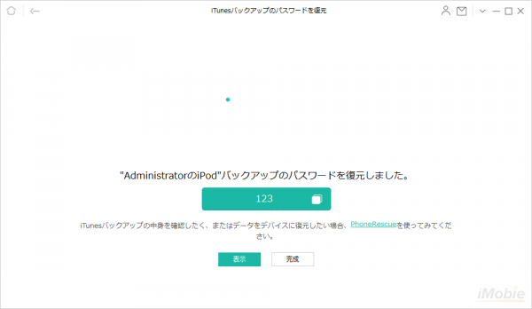 Step 4.パスワードの複雑さによって、復元にかかる時間は異なりますので、少々お待ちください。復元が完了すると、iTunesバックアップのパスワードが表示されます。その後、このパスワードを使用してローカルバックアップの暗号化を解除することができます。