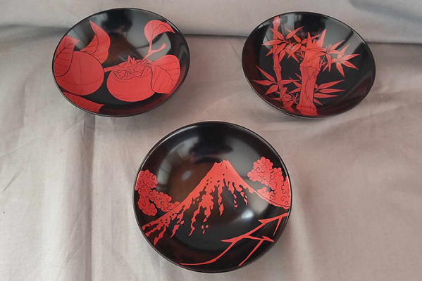 お選びいただいた器に、漆で模様を描いてもらい、描いた所に朱の顔料を蒔き付けます。その後、工房に持ち帰り、照井さんにより漆をすり、磨き仕上げます。(仕上がり 約1ヶ月)