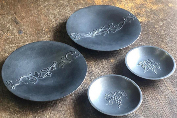 お選びいただいた器に、錆絵用の絞り筒で、模様を筒描きしていただきます。その後、工房に持ち帰り、伝統的な会津鉄錆塗りと四分一塗りを組み合わせた冨樫さん独自の技法で仕上げていただきます。仕上がりは銀色になります。(仕上がり 約1ヶ月半)