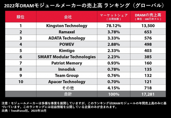 台北 - 11月2日, 2023 - メモリストレージ製品および技術ソリューションの世界的リーダーであるKingston Technologyは本日、アナリスト企業であるTrendForce社による最新の売上高別ランキングにおいて、サードパーティDRAMモジュールサプライヤーとして世界トップにランクインしたことを発表しました。Kingstonは、売上高135億米ドル、推定78.12%の市場シェアを獲得し、第1位の座を維持しました。TrendForce社によると、2022年におけるDRAMモジュールの売上高は業界全体で前年比4.6%減少。Kingstonの売上高は若干減少したものの、20年連続でトップに君臨しています。