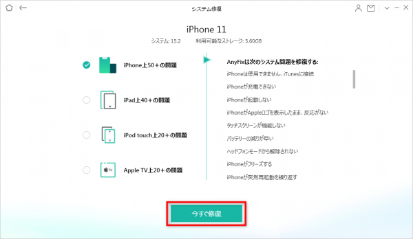 ステップ1.AnyFixをダウンロードしてコンピュータで実行し、iPhoneをコンピュータに接続し、ページの上部にある「システム修復」を選択します。