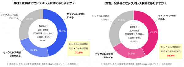 →20〜50代の既婚男性の70.1%、既婚女性の66.2%がセックスレス傾向と回答