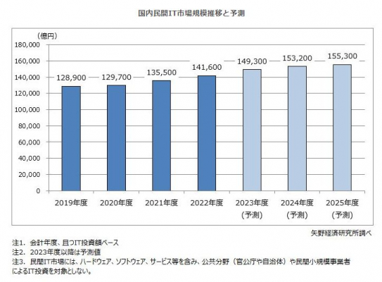 【矢野経済研究所プレスリリース】国内企業のIT投資に関する調査を実施(2023年)〜2022年度の国内民間企業のIT市場規模は前年度比4.5%増の14兆1,600億円、2023年度は同5.4%増予測〜