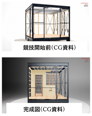 競技の舞台となるのは、実際の積水ハウスの鉄骨2階建て住宅で組み建てられている、広さ3.5m四方、およそ7.5畳の空間。作業プロセスは大きく10段階に分かれ、天井の石膏ボード貼り付けに始まり、壁の配管処理、扉の枠となる出入り枠の設置や、カウンターキッチンに見られる腰壁の設置や笠木設置、腰壁のニッチ(小物を置くスペース)の施工まで、3.5m四方の空間に実際の現場での作業が詰め込まれた内容です。