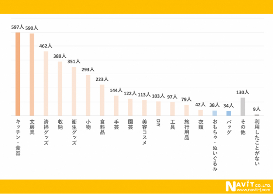 こちらは複数回答にていただいています。1番多かったのは「キッチン・食器」で597人となっています。僅差で2番目に多かったのが「文房具」で590人です。そして「清掃グッズ」が462人と続いています。いずれも日常生活に密着した製品を購入することが多いようです。