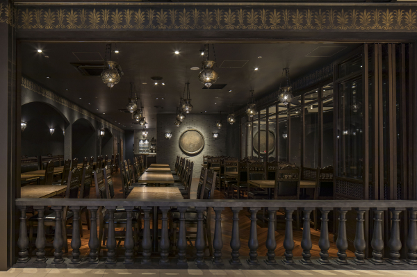 店内には13世紀のマルムーク朝時代様式の真鍮製ランプが天井から吊り下がり、壁にはパルメット文様、アンティーク飾り皿、壁掛ランプ、さらに椅子、テーブル、食器に至るまで、目に映るものは日常と切り離され、東京都心に居ながらにして、さながらエジプトの王宮のような、異文化にして非日常のアラビア空間に包まれます。
