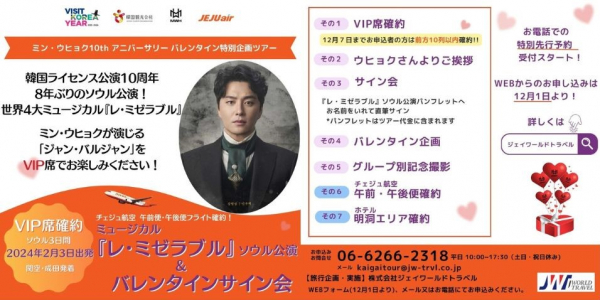 【ミン・ウヒョク10thAnniversary バレンタイン特別企画ツアー】の申込・お問い合わせは株式会社ジェイワールドトラベルへ、