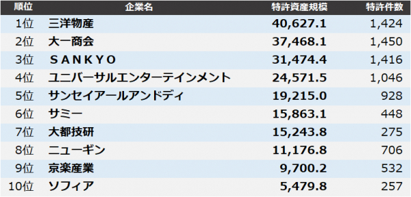 【遊技機】特許資産規模ランキング2023 トップ3は三洋物産、大一商会、SANKYO