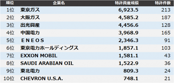 【電力・ガス・エネルギー】特許資産規模ランキング2023 トップ3は東京ガス、大阪ガス、出光興産