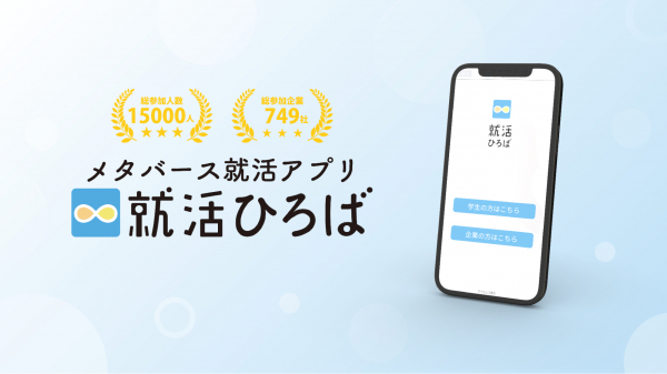 就活ひろばのコンセプトは“思いがけない出会い”。低学年から業界研究ができ、企業のことを気軽に知ってもらえるスマートフォンアプリです。メタバース(仮想空間)を自由に歩き回れる自分専用のアバターを利用し、今まで知らなかった企業に出会うことができます。気になる企業を見つけたら、ブースで情報収集をしたり、説明会への参加が可能。担当者とチャットで会話もできます。