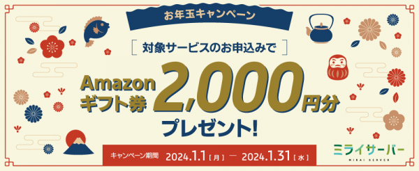 ミライサーバー(運営会社:アシストアップ株式会社、所在地:大阪府大阪市、代表取締役:青木 勝彦)は、2024年1月1日(月)〜1月31日(水)の期間、お年玉キャンペーンを実施いたします。