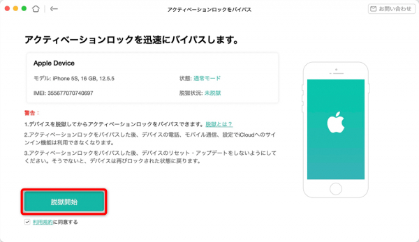 ステップ3: 脱獄が完了したら、アクティベーションロックを回避できます。まず、デバイスのモデル、iOSバージョン、IMEIなどを確認し、次に「今すぐ開始」をタップします。
