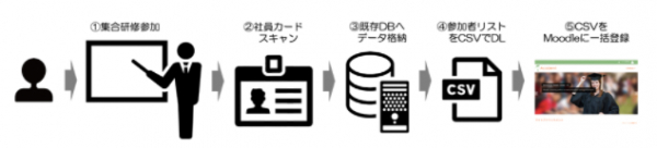 「集合研修」時に社員カードをスキャンして出席確認を行うツールと連携し、出席データを「Moodle(ムードル)」に取り込んで、一括管理。オンラインとオフラインの両方を扱えることで、eラーニング管理のメリットを向上させている。