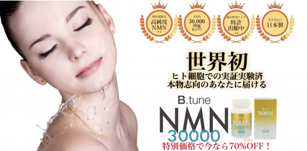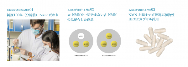 「B.tune NMN30000」は、加齢による身体機能の低下と、サーチュイン遺伝子とNAD+の関係性に着目し、世界初の臨床試験で裏付けられた商品です。実測値で純度100%のNMNを1カプセルに250mg詰め込んだB.tuneのNMN。このNMN250mgと、カプセルに詰める際の潤滑剤としてステアリン酸カルシウム5mg、カプセルの素材であるHPMCの3つだけで作られています。余分な成分を極力を入れずに、良質のNMN だけを自信と誇りを持ってお届けします。医療機関の一部など、限定で販売されていた商品ですが、広く購入希望の声を受けて、今回、一般販売を開始することになりました。