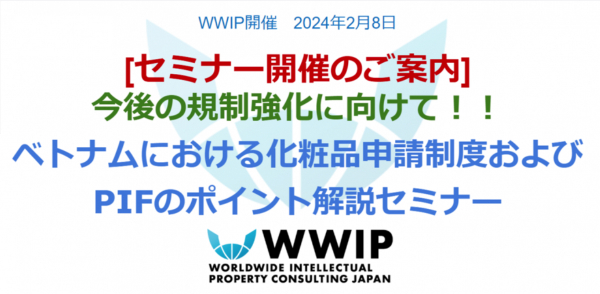 株式会社ワールドワイド・アイピー・コンサルティングジャパン (以下「WWIP」) は、2024年2月8日(木)15:00〜16:30に、「今後の規制強化に向けて!!ベトナムにおける化粧品申請制度およびPIFのポイント解説セミナー」を開催いたします。(HP:https://wwip.co.jp/seminar20240208/)