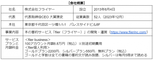 株式会社フライヤーは、本の要約サービス「flier(フライヤー)」を運営する、ITベンチャー(2013年6月設立)です。最大の特長は「書評(レビュー)」ではなく「要約」である点です。書き手の主観が入る書評とは異なり、著者の主張や論理(重要ポイントや全体像)を忠実にまとめ、読者に伝えます。書評でないため、出版社と著者から要約の許可を得る必要があり、要約した原稿にも目を通していただくことで、高品質なサービスを提供しています。