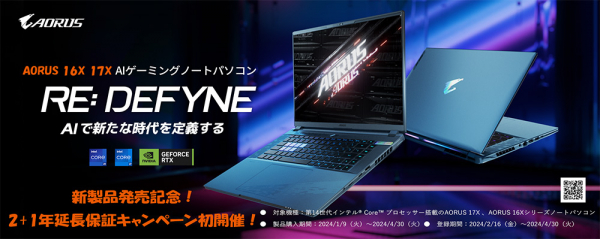 第14世代Intel Coreプロセッサ搭載製品の発売を記念して、通常2年間の製品保証のところ、1年延長して3年間の製品保証とする「2+1年延長保証キャンペーン」を実施いたします。対象製品は、第14世代Intel Coreプロセッサを搭載したゲーミングノートPC「AORUS 17Xシリーズ」および「AORUS 16Xシリーズ」。2024年1月9日〜4月30日の期間に対象製品を購入し、AORUSメンバーシップにて4月30日までに製品登録をすると、保証期間が1年間延長されます。