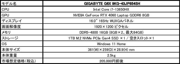 GIGABYTE、コストパフォーマンスに優れた第13世代Core i7搭載16.0型ゲーミングノートPC「G6X 9KG-43JP854SH」を発売