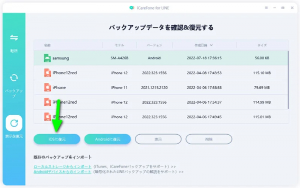 Step1.左側の「表示&復元」項目をタブして、LINE復元画面に移動します。1つのLINEバックアップを選択し、「iOSに復元」または「Androidに復元」をクリックします。