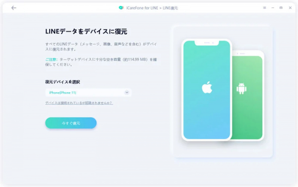 Step2.LINEデータを取得したいiOSデバイスをパソコンに接続し、「今すぐ復元」をクリックします。