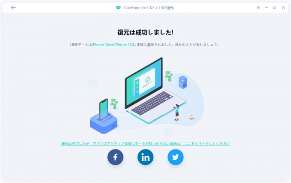 Step3.復元作業中は、デバイスとパソコンの接続を切断しないでください。Step4.LINEデータが正常に復元されると、デバイスが再起動し、LINEデータを確認できます。