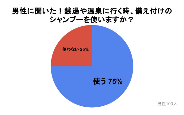 「銭湯や温泉に行く時、備え付けのシャンプーを使いますか?」のアンケート調査を行ったところ、『使う』が75%、『使わない』が25%となり、男性の4人に1人は備え付けのシャンプーを使わないことがわかりました。