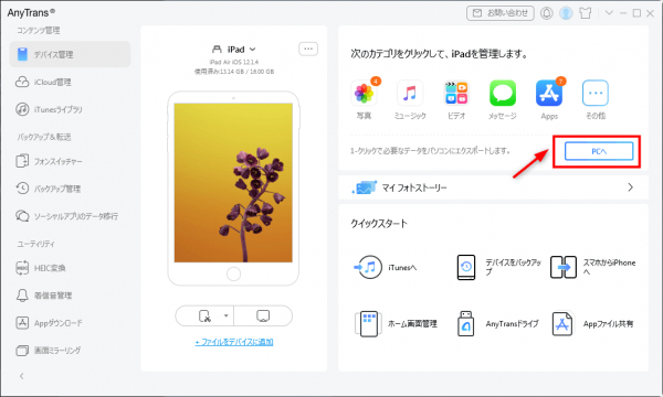 ステップ2.AnyTransを開いて、左側の欄で一つ目のカテゴリーを選んで、「PCへ」をクリックします。