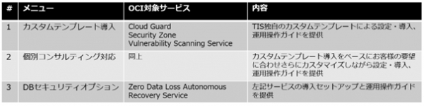 今回追加するセキュリティ対策アセットメニューは、Oracle Cloud Infrastructure(以下:OCI)運用における設定や作業およびDatabase等の脆弱性をチェックし、可視化・予防対処を行うことができます。OCIのセキュリティサービスであるOracle Cloud GuardやOracle Security Zones、Oracle Data Safe、Zero Data Loss Autonomous Recovery Service等を活用し、企業のミッションクリティカルシステムのOCIでの稼働を想定したTIS独自の設定や運用ガイドを提供します。