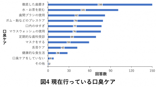 現状行っている口臭ケアについて複数選択で回答を求めたところ、「徹底した歯磨き」が最も多くあげられていました。