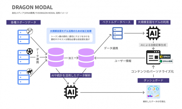 DRAGON MODAL は、当社のスポーツデータベースと LLM、生成AI を組み合わせたサービスです。サービスの特徴は以下の通りです。