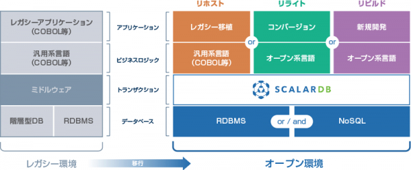 「メインフレームモダナイゼーションサービス」では、レガシーアプリケーション資産の大幅な修正を伴わずに、最適な移行方式により段階的なシステムの刷新が可能となります。また、データベースの移行・最適化については、データ加工・データ変換処理をノンプログラミングかつ低価格で実装可能なツール「DataMagic」に加え、複数のデータベース間を繋いで整合性を保証する汎用的なトランザクションマネージャー「ScalarDB」を組み合わせることで実現しています。