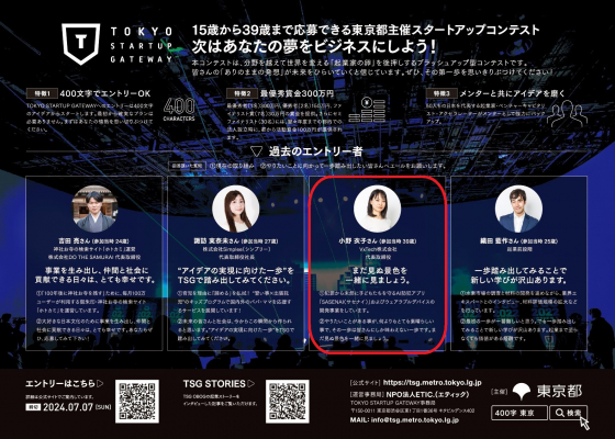 10回目となった昨年度のエントリーは過去最高の2,963件が応募。今年度の応募もスタートし、弊社代表の小野がTSG2024の募集フライヤーに掲載されました。同フライヤー内で小野はやりたいことに向かって一歩踏み出したい応募を検討する方へ「やりたいことがあることは、何よりも素晴らしいこと。その一歩は皆さんにしか踏み出せない一歩です。まだ見ぬ景色を一緒に見ましょう。」とエールを送っています。