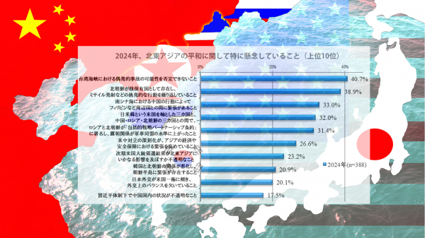 2024年の北東アジアの平和をめぐって、日本の有識者が最も懸念しているのは、「台湾海峡における偶発的事故」の40.7%(昨年27.4%)と「核保有国・北朝鮮の挑発的な行動」38.9%の二つが並びました。一方、この地域に「日米韓と中ロ朝の間で、『新冷戦』を想起させる対立構造が生じ始めている」(32%)、「『包括的戦略パートナーシップ条約』に署名した露朝関係が軍事同盟の水準に上がったこと」(31.4%)の二つもそれぞれ3割を超え、関係強化が進む「ロシアと北朝鮮」の動向が北東アジアの新たなリスクとして急浮上してきていることが明らかとなりました。