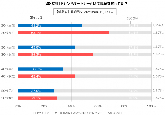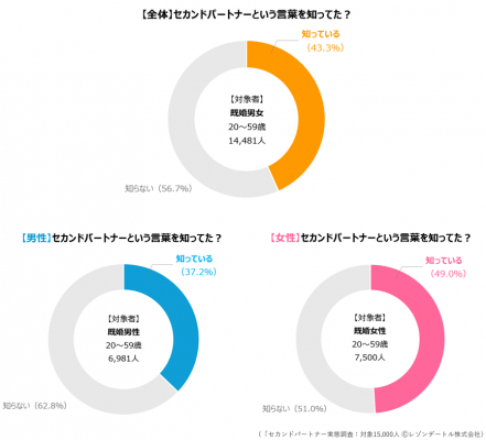 なお、「意味は知らなかった」には、セカンドパートナーという言葉は知っていても意味までは知らなかった人たちが含まれます。