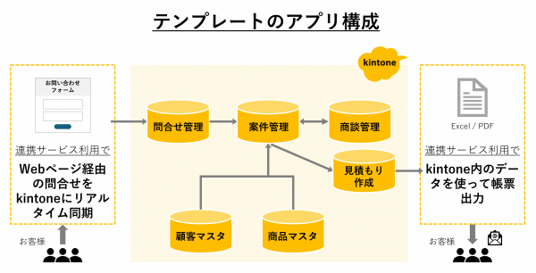 例えば、「営業案件管理テンプレート」は、問い合わせ管理、商談履歴、見積もり作成ができるアプリと、それらの情報を一括管理する案件管理アプリ、顧客マスタ・商品マスタなどのアプリから構成されています。