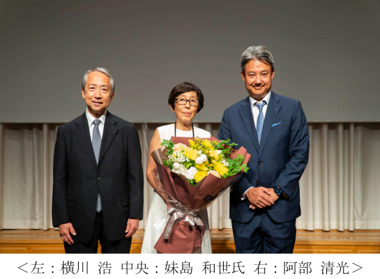 講演では、環境との調和をテーマに手掛けてこられた数々のプロジェクト、及び進捗中のプロジェクトに関して説明や紹介がありました。会の最後には、阿部興業社外取締役の横川浩より花束を贈呈し、感謝をお伝えしました。