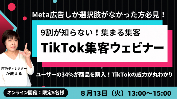 【9割が知らない!集まる集客(R)TikTok集客ウェビナー】ユーザーの34%が商品を購入!TikTokの威力が丸わかり 8/13開催