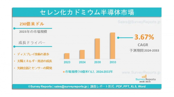 サーベイレポートの専門家たちは、セレン化カドミウム半導体市場調査を分析し、2023年に生成されたセレン化カドミウム半導体市場規模が230億米ドルであることを発見しました。さらに、セレン化カドミウム半導体市場シェアは、2033年末までに330億米ドルの感動的な収益を予測します。セレン化カドミウム半導体市場は、2024年と2033年の予測期間中に約3.67%のCAGRで成長することが提案されています。