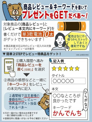 対象商品を当店でご購入の上、「商品レビュー」と「レビューの本文内にキーワード」を書くと、「単三乾電池10本」をプレゼントいたします。