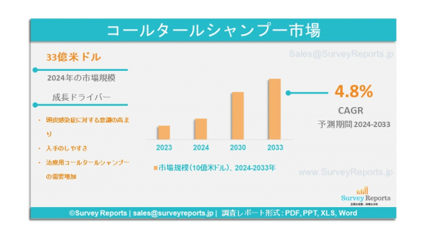 Surveyreportsの専門家はコールタールシャンプー市場の調査を分析し、2023年にコールタールシャンプー市場規模が33億米ドルに達すると予測した。さらに、コールタールシャンプー市場のシェアは、2033年末までに53億米ドルの収益に達すると予測されている。コールタールシャンプー市場は、2024年から2033年の予測期間中に、年間平均成長率(CAGR)約4.8%で成長すると予測されている。