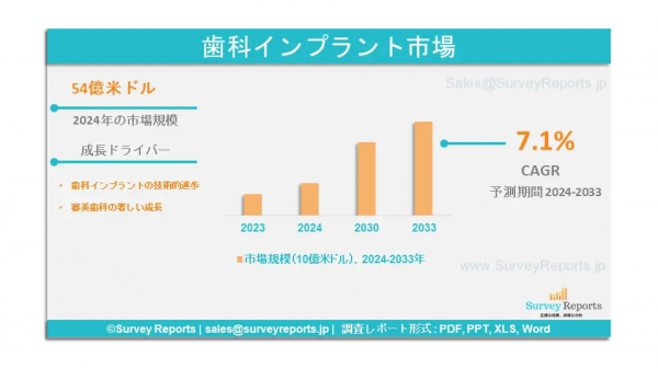 Surveyreportsの専門家は、歯科インプラント市場の調査を分析し、歯科インプラント市場規模は2024年に54億米ドルに達すると予測した。さらに、歯科インプラント市場のシェアは、2033年末までに89億米ドルに達すると予測されている。歯科インプラント市場は、2024年から2033年の予測期間中に、年間平均成長率(CAGR)約7.1%で成長すると予測されている。